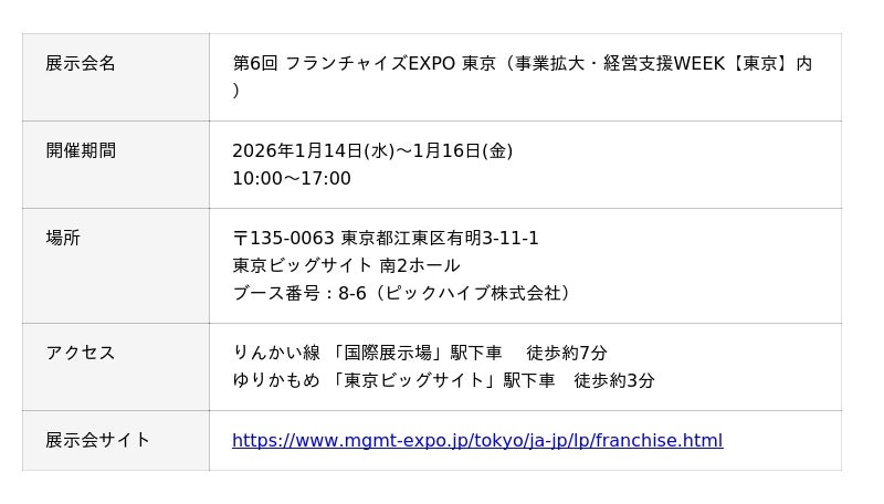 キタムラ・ホールディングス グループのピックハイブ株式会社(本社:東京都新宿区、代表取締役社長兼COO:大迫 由典)が運営する「セルフ写真館 PICmii(読み:ピックミー、以下:PICmii) https://picmii.studio/ 」は、2026年1月14日(水)〜1月16日(金)の期間、東京ビッグサイトで開催される「第6回フランチャイズ EXPO」に出展いたします。