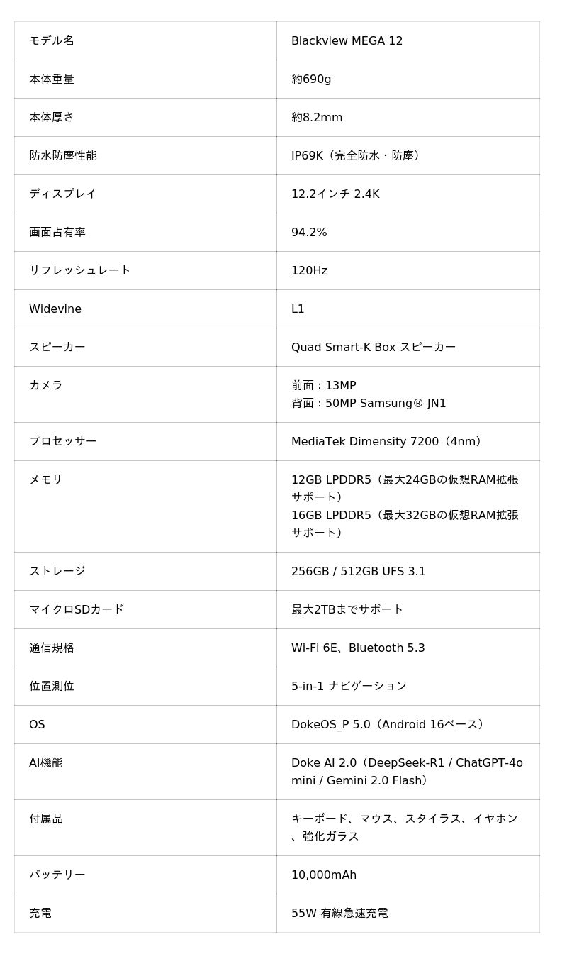 Blackview MEGA 12 の詳細スペック・仕様