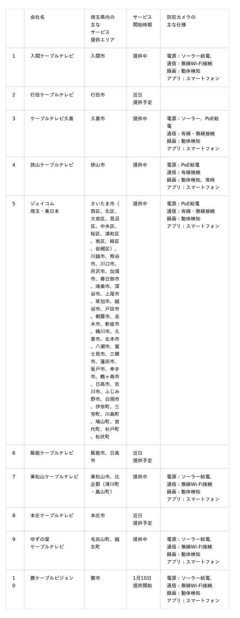 埼玉ケーブルテレビ連盟(昭和61年設立)は、1月10日に加盟各社が共同で地域の防犯カメラ事業に取り組むことを発表します。本取り組みは、県域を中心に放送事業を営む10社が技術と地域網を活かして連携し、防犯カメラサービスを各エリアで順次提供し、地域の安心・安全に寄与するものです。