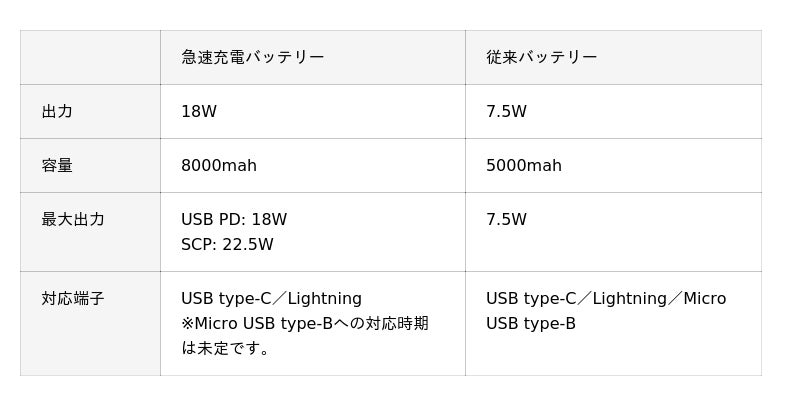 - バッテリーの仕様について:このたび展開する予定のバッテリーは、Type-C、Lightningの2端子に対応いたします。Type-Bにも対応した3端子タイプも今後展開を予定していますが、時期は未定です。