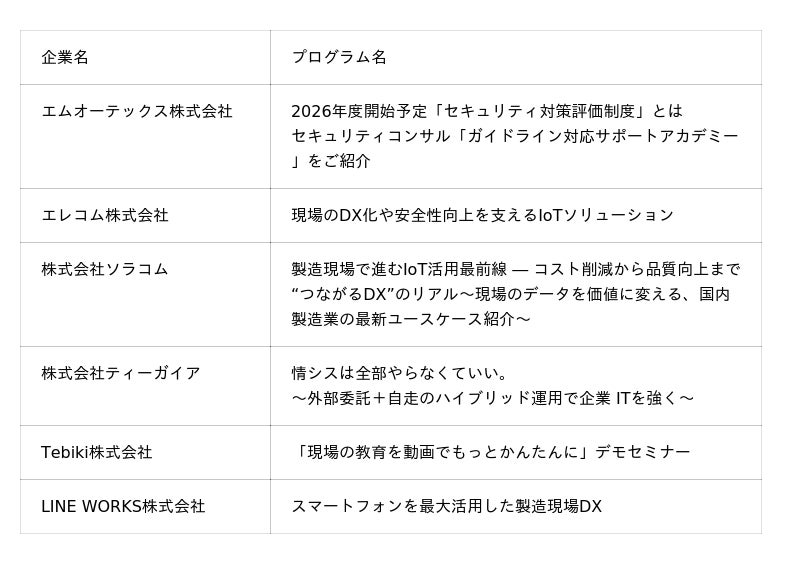 本セミナーでは、製造現場に精通した6社※が登壇し、事例や具体的な活用イメージを交えながら、業務や運用コストの削減方法、費用対効果について導入事例を交えてご紹介します。また、現地会場では実際のソリューションや端末に触れられる展示・相談スペースを設け、担当者への相談を通じて課題解決のヒントをお持ち帰りいただけます。デジタル化やDXに課題を持つ製造業の皆さまに無料で参加いただけるイベントです。