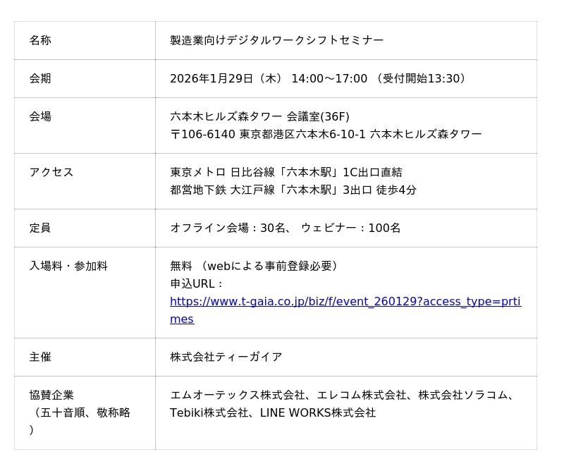 株式会社ティーガイア(本社:東京都渋谷区、代表取締役社長:石田 將人、以下、当社)は、2026年1月29日(木)に、六本木ヒルズ森タワー会議室およびオンラインにて、製造業界向けに「業務改善」と「セキュリティ」をテーマにしたハイブリッドセミナー「製造業向けデジタルワークシフトセミナー〜デジタル化による『業務改善』と『セキュリティ』のアプローチ〜」を開催します。