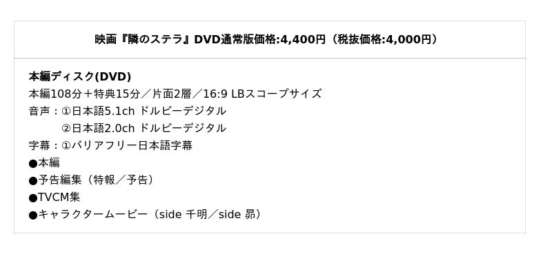 特典ディスクの収録分数が当初予定の90分から200分に大幅に増えました!!劇場公開までに実施された5つのイベント映像をすべて収録!福本さんと八木さんがシークレット鑑賞して会場を騒然とさせた公開御礼舞台挨拶もしっかり収録されています。イベントに来られなかった方も十分にお楽しみいただけます。また、劇場公開を記念して全国で放映された、福本さんと八木さんが映画『隣のステラ』スタッフのエピソードを交え制作秘話を語り尽くす特別トーク番組「隣のステラに願いを込めて」を全6エピソードすべて収録!見逃してしまった方も、もう一度見たい方も必見です!本編と合わせて映画『隣のステラ』を余すところなくお楽しみいただけます!商品情報 ※商品仕様、デザインは予告なく変更する場合がございます