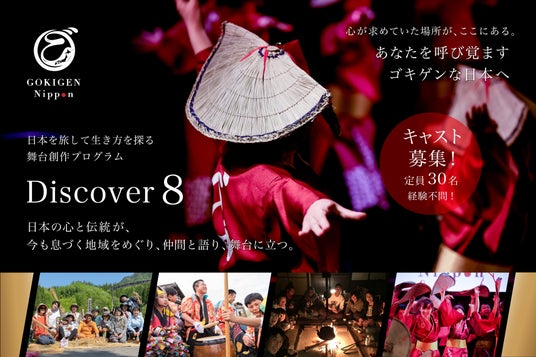 一般社団法人GOKIGEN Nippon(長野県松川町、代表理事:北原太志郎)は、日本を旅して生き方を探る舞台創作プログラム「Discover 8」の参加者(キャスト)30名を募集します。2月1日より松川町で無料体験説明会(全4回)を開催します。