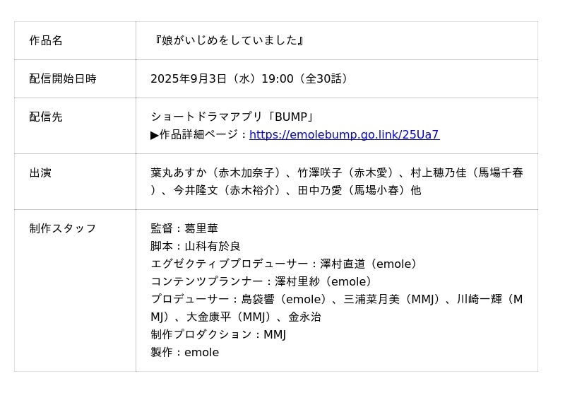 ショートドラマアプリ「BUMP」を開発・運営するemole株式会社(本社:東京都目黒区、代表取締役:澤村直道、以下、emole)は、「BUMP」における2025年下半期(2025年7月1日〜12月31日)のショートドラマ視聴ランキング・トップ5を発表しました。視聴数第1位には、『娘がいじめをしていました』が選ばれています。