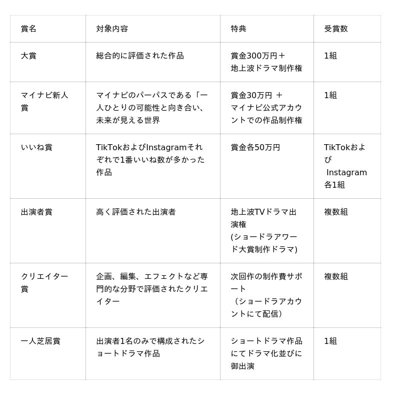「マイナビ ショードラアワード 2026」は、縦型ショートドラマ動画の日本最大級コンペティションとして2025年11月1日(土)〜2026年2月28日(土)まで作品を募集しています。13歳以上であれば、TikTokまたはInstagramアカウントをお持ちのどなたでもストーリー性のあるショートドラマ作品で参加が可能です。応募は指定ハッシュタグ「#マイナビショードラアワード2026」を付けて投稿するだけ。応募作品の中から、大賞ほか多数の賞を選出し、受賞者には賞金や地上波ドラマ制作権、次回作制作サポートなど多彩な特典を用意しています。