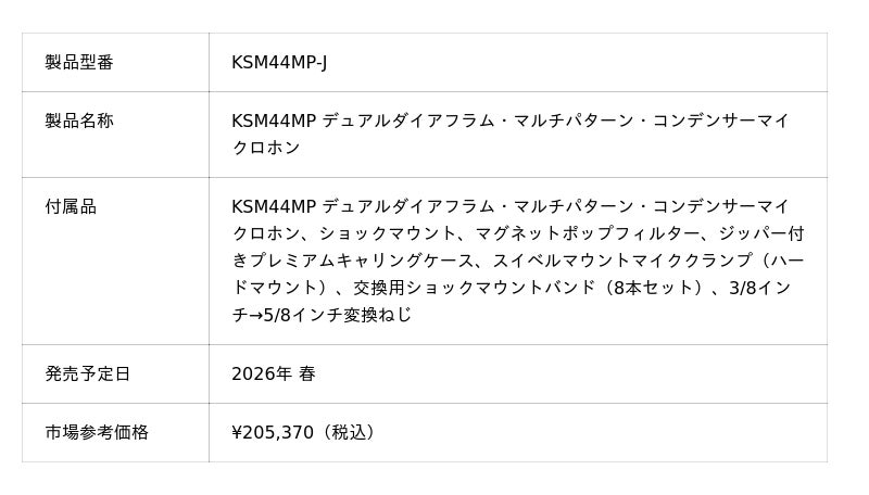 「わたしたちの使命は、音響のプロフェッショナルやアーティストに、卓越した音質をもたらす高品質なツールを届けることです」と、Shureのグローバルマーケティング/プロダクトマネジメントのアソシエイト・バイス・プレジデントであるEduardo Valdesは述べています。「新しいKSMマイクロホンシリーズは、設計とエンジニアリングの両面で大きく進化し、レコーディングスタジオの多様化するニーズに応える製品に仕上がっています。旧モデルからの回路設計の改良や多様なカプセルオプション、さらにプレミアムなアクセサリーにより、プロが求めるサウンドを正確に収録できるよう細部に至るまで工夫しています。ホームスタジオでもプロフェッショナルスタジオでも、高品質の機器を手に入れやすくすることで、すべてのプロの卓越したパフォーマンスを支えています」