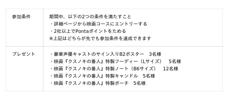 本キャンペーンには、Ponta提携社・サービスの46社以上が参加します。エントリーなしでどなたも対象となり、期間中、対象のPonta提携社・サービスを2社以上利用して、Pontaポイントをためた方の中から抽選で合計100万名様に、ためたポイントの最大100倍のポイントをプレゼントします。さらにキャンペーンページから「映画コース」にエントリーをした方の中から抽選で合計30名様に、豪華声優キャストのサイン入りポスター(B2サイズ)や映画オリジナルの限定グッズをプレゼントします。