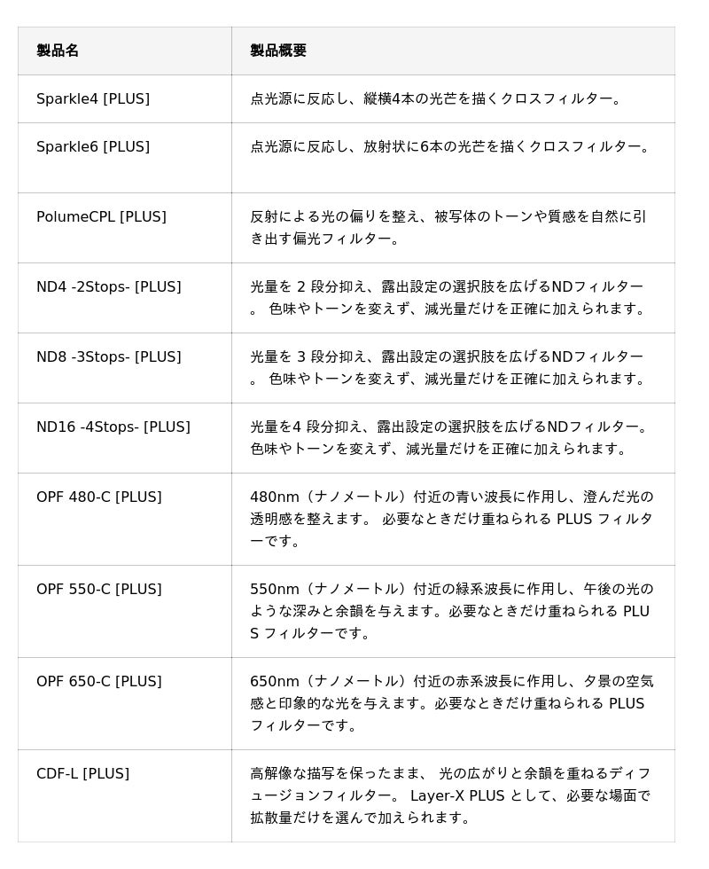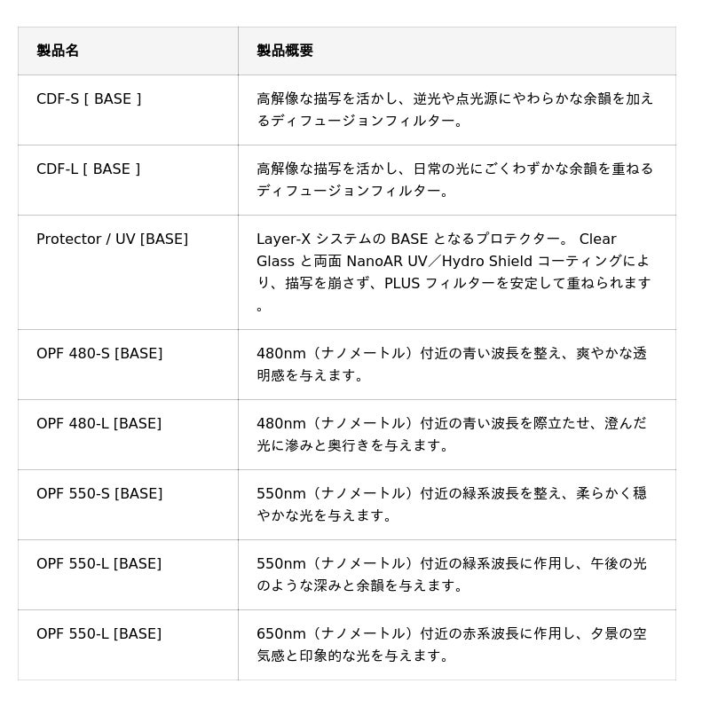 Layer-X は、常用できるベースフィルターと、必要な表現だけを重ねる効果フィルターを組み合わせるレイヤー構造を採用したレンズフィルターシステムです。