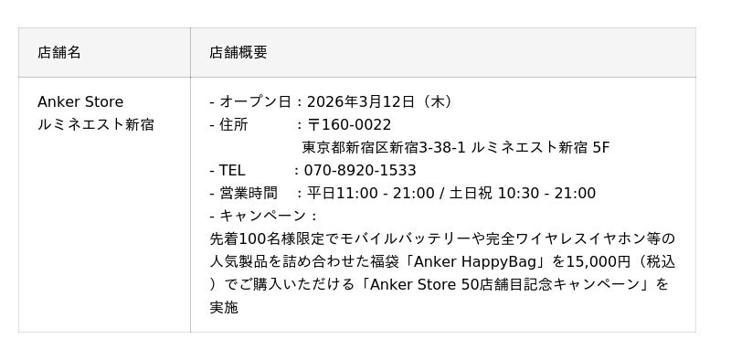 アンカー・ジャパン株式会社の子会社として常設直営店Anker Storeの運営事業を担うアンカー・ストア株式会社(本社:東京都港区、代表取締役CEO:猿渡 歩)は、2026年3月12日(木)に全国50店舗目となる常設直営店「Anker Store ルミネエスト新宿」をオープン。さらに2026年2月以降、「Anker Store アミュプラザ鹿児島」、「Anker Store 阪急西宮ガーデンズ」、「Anker Store ららぽーと横浜」、「Anker Store ららぽーと沼津」の計4店舗を順次オープンいたします。