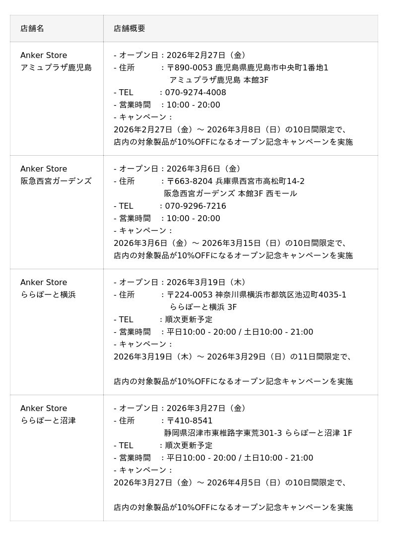 また今春Anker Storeは出店をより一層拡大し、2026年2月に「Anker Store アミュプラザ鹿児島」、3月には「Anker Store ルミネエスト新宿」に加えて「Anker Store 阪急西宮ガーデンズ」、「Anker Store ららぽーと横浜」、「Anker Store ららぽーと沼津」の計4店舗を順次オープンいたします。