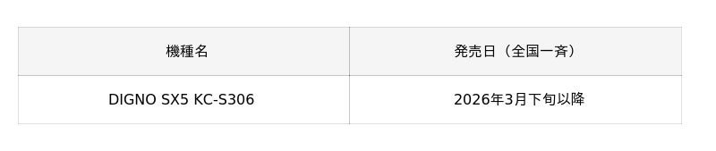 株式会社NTTドコモ(以下、ドコモ)は、長く使えあんしんのサポートを備え、法人のお客さま※1の期待に応えるスマートフォン「DIGNO (R) SX5 KC-S306」を2026年3月下旬以降※2に発売いたします。