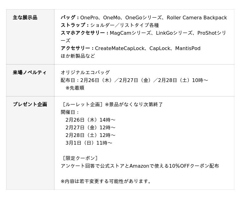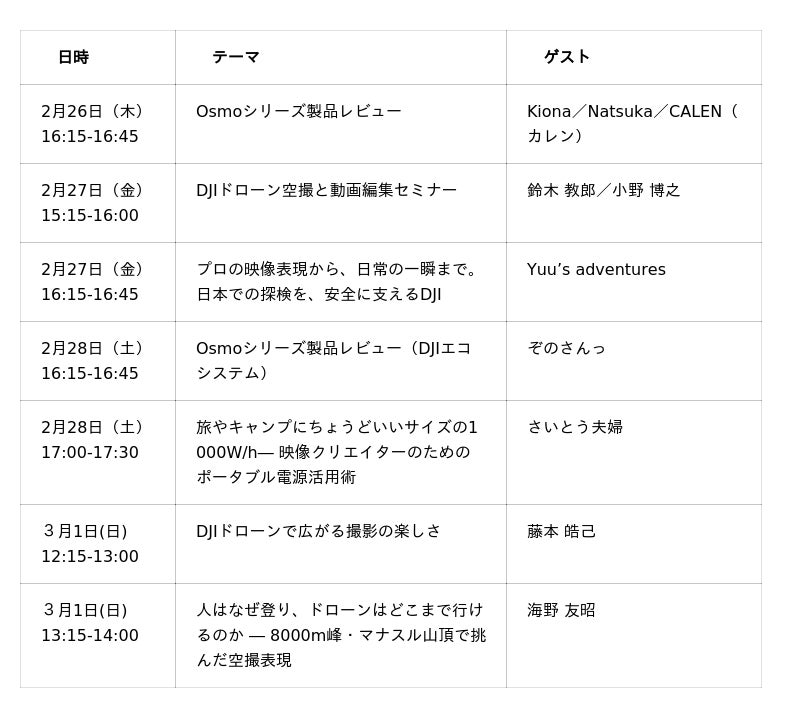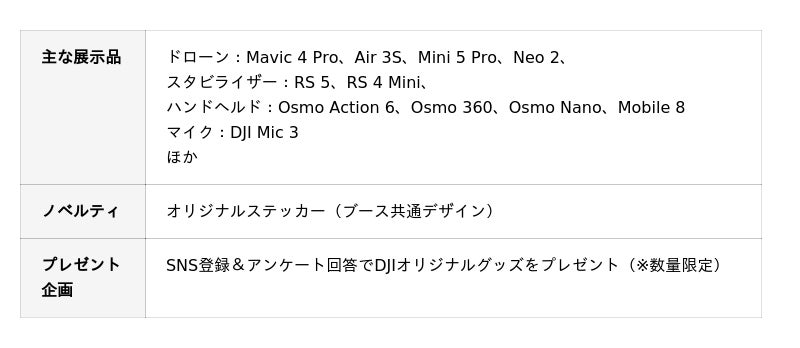 最先端の技術を搭載したDJIドローンの展示をはじめ、最新のアクションカメラやハンドヘルド、圧倒的なディテールと色表現を実現するHASSELBLADのカメラ&レンズ、ユーザーニーズを叶えるプロダクトが人気のPGYTECHのカメラバッグやカメラアクセサリーを、各ブースにてタッチ&トライでご覧いただけます。来場者限定のノベルティやプレゼント企画を実施しますので、ぜひブースにお立ち寄りください!