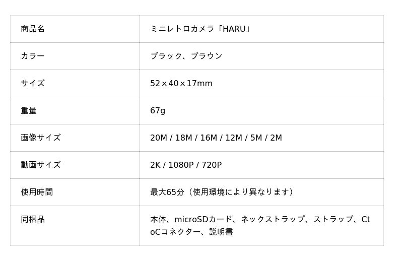 小さいカメラではキーチェーンで持ち運びするのがよくありますが、このミニレトロカメラ「HARU」は首掛け用のストラップも付属していて、本格的なカメラのように持ち運ぶことができます。