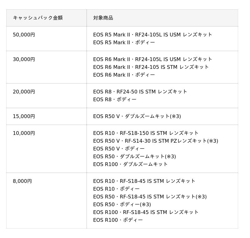 <対象商品とキャッシュバック金額>