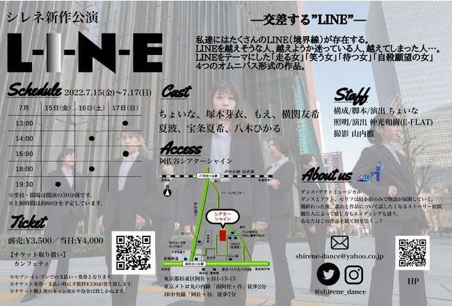 シレネによる『LINE』が2022年7月15日(金)〜17日(日) にシアターシャイン (東京都杉並区)にて上演されます。チケットはカンフェティ(運営会社:ロングランプランニング株式会社、所在地:東京都新宿区、代表取締役:榑松 大剛)にて5月15日(日)より発売開始予定です。