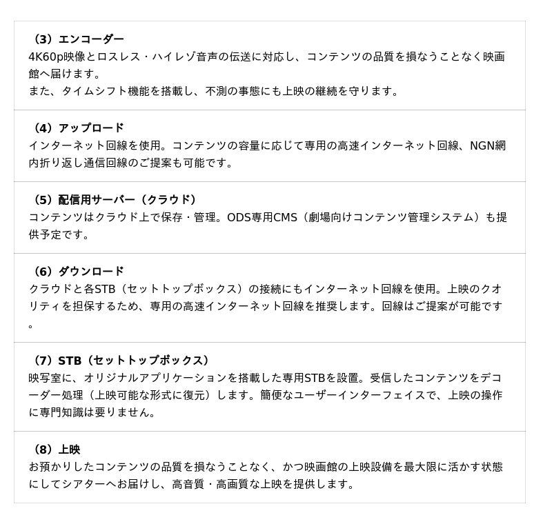 JUUQXは、ヒビノイマジニアリングが提供する、映画館のODS上映に特化した次世代配信サービスです。最大の特徴は、圧倒的な「高音質」と「高画質」。配信側のエンコーダーにはインターネット動画配信システムKORG「Live Extreme」を採用し、再生側のデコーダーは、ヒビノイマジニアリングが開発したJUUQX専用のオリジナルSTB(セットトップボックス)(※2)アプリケーションを採用しています。コンテンツの魅力と映画館の優れた音響・映像設備を最大限に活かした上映を、高い安定性で実現。質の高いエンターテインメントを求めるODSに最適です。JUUQXの配信プロセス