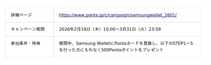 今回のサービスアップデートを記念し、2026年2月19日(木)〜3月31日(火)の期間中、Samsung WalletにPontaカードを追加した方にもれなく500Pontaポイントをプレゼントします。