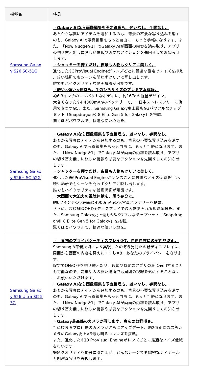 株式会社NTTドコモ(以下、ドコモ)は、Galaxy AI機能「Now Nudge※1」が搭載された「Samsung Galaxy S26 SC-51G」「Samsung Galaxy S26+ SC-52G」「Samsung Galaxy S26 Ultra SC-53G」を2026年3月12日(木)に発売いたします※2。発売に先立ち、2026年2月26日(木)から予約受付を開始いたします。