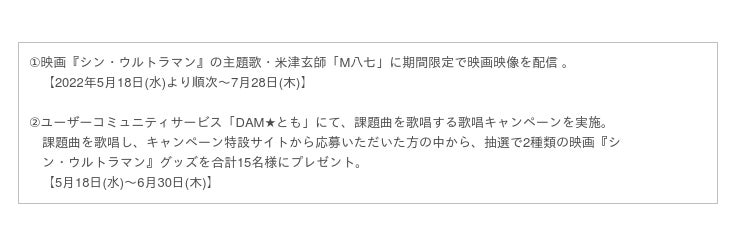 株式会社第一興商は、映画『シン・ウルトラマン』の全国公開を記念して、 5月18日より【映画『シン・ウルトラマン』& LIVE DAM Aiコラボキャンペーン】と題してさまざまな企画を展開します。 映画主題歌である米津玄師の「M八七」が映画映像を見ながら歌えるほか、同楽曲を課題曲とした豪華映画グッズが当たる歌唱キャンペーンを実施します。