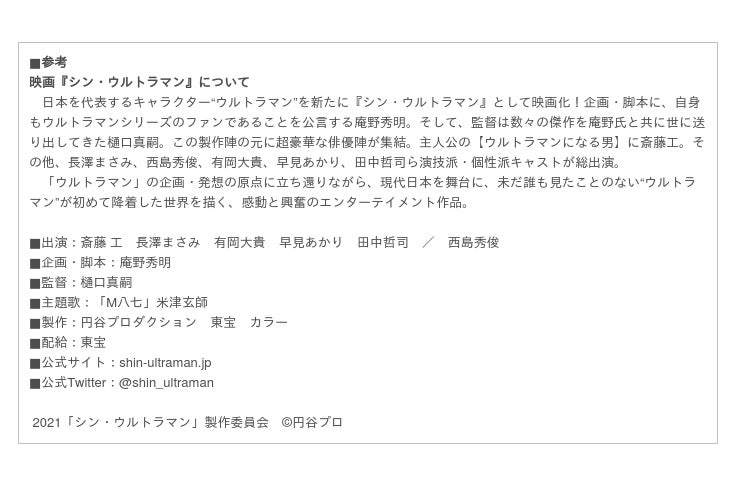 映画『シン・ウルトラマン』は、 企画・脚本を庵野秀明、監督を樋口真嗣が務め、国民的キャラクター「ウルトラマン」の発想の原点に立ち返りながら、現代日本に初めて“ウルトラマン”が降着した世界を描く、感動と興奮のエンターテインメント超大作です。5月13日の全国公開を前に早くも大きな注目を集めています。