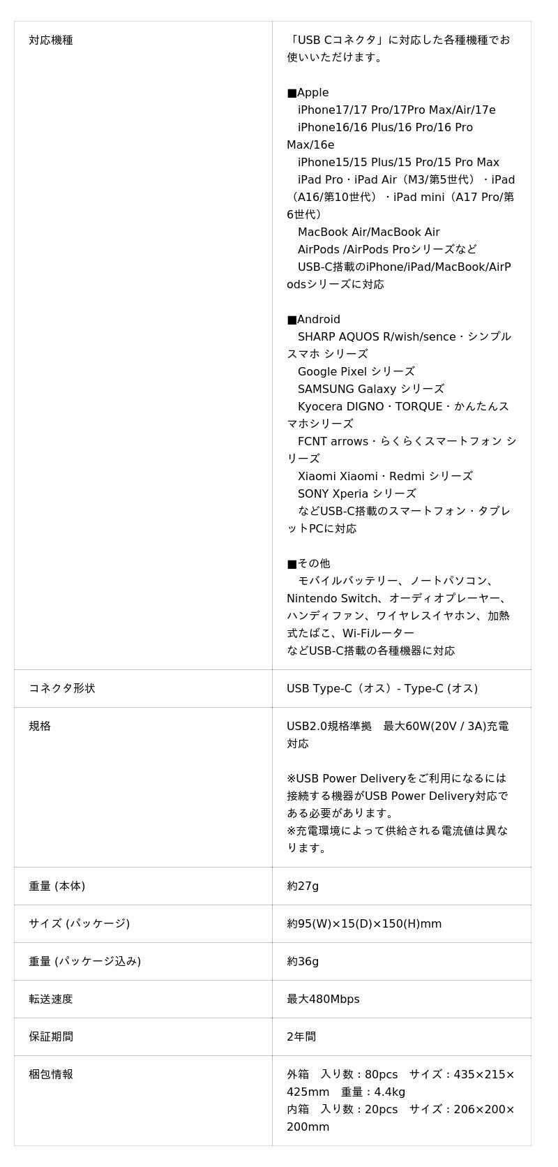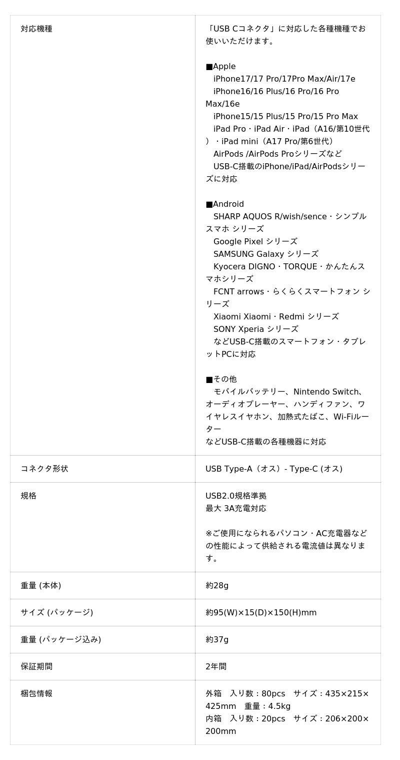 ・スマートフォンやタブレットを3Aパワフル充電(USB-A to USB-Cのみ)