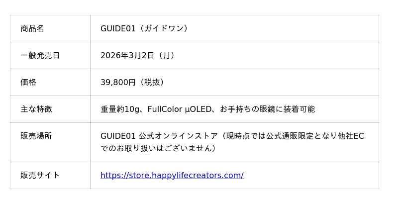 HappyLifeCreators株式会社(本社:大阪市淀川区、代表取締役:牧長 心)は、クラウドファンディング「GREEN FUNDING」にて目標比5,504%(支援額1,650万円超)という記録を達成した世界最小・最軽量級スマートディスプレイ「GUIDE01(ガイドワン)」を、2026年3月2日(月)より公式サイトにて一般販売開始いたしました。