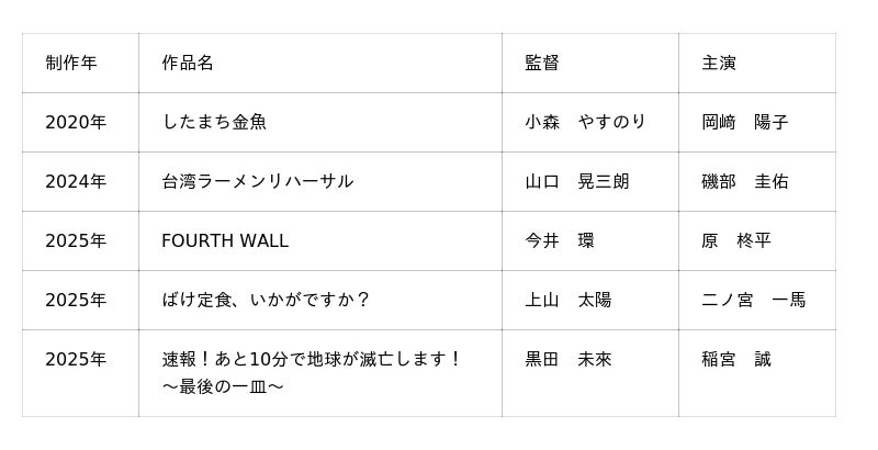 2020年から2025年までに5作の映画を制作し、2026年はあらたに短編映画『朝が来るなら逃げないつもり』を制作します。