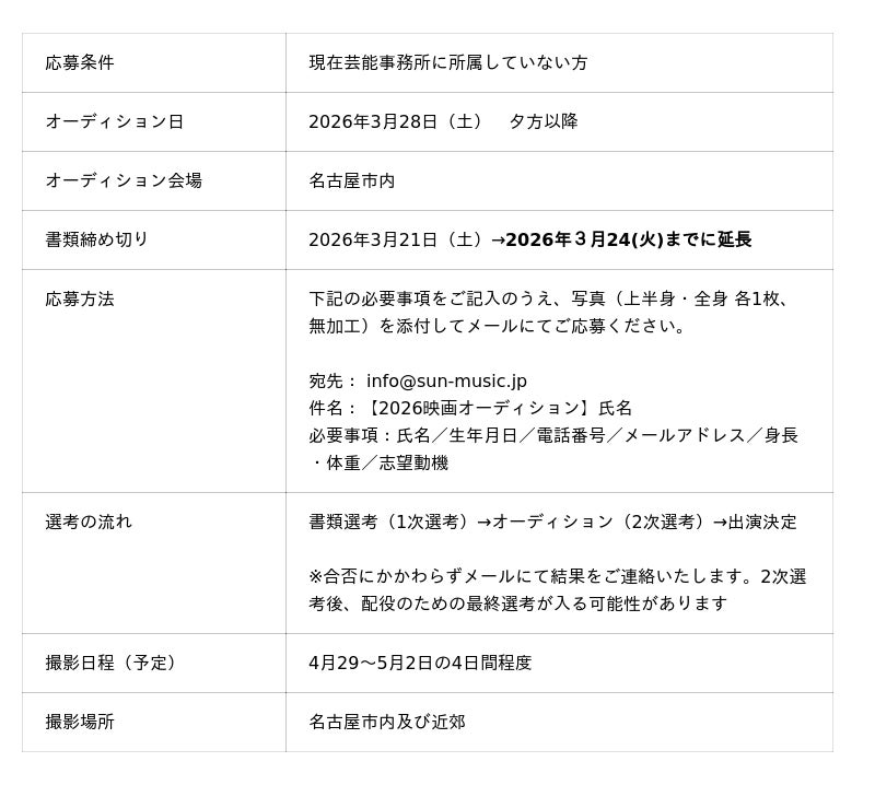 また、本作への出演者を広く募集するオーディションを令和8年3月28日(土)に開催します。