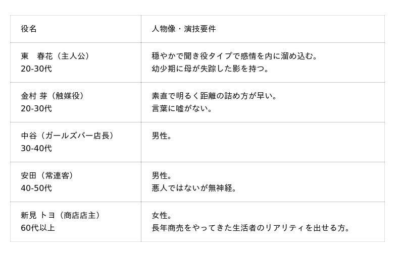 また、募集の配役は以下のとおりとなります。