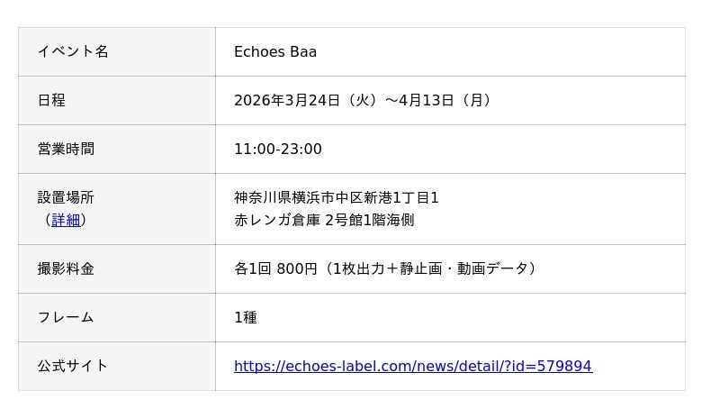 キタムラ・ホールディングス グループのピックハイブ株式会社(本社:東京都新宿区、代表取締役社長 兼 COO:大迫 由典)が運営するセルフフォトブランド「Photomatic(読み:フォトマティック)」は、横浜で開催される都市型フェス『CENTRAL MUSIC & ENTERTAINMENT FESTIVAL 2026』の内、横浜赤レンガ倉庫で開催されるイベント「Echoes Baa(エコーズ バー)」とコラボレーションしたオリジナルフレームを2026年3月24日(火)〜4月13日(月)の期間、Photomatic 横浜赤レンガ倉庫で限定発売します。