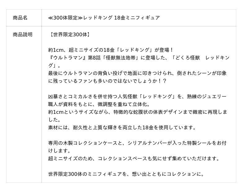 株式会社ユートレジャー(本社:東京都新宿区、代表取締役社長:青木 興一、株式会社ケイ・ウノの連結子会社)は、『ウルトラマン』に登場した「レッドキング」の18金製ミニフィギュアの予約受付を2026年3月19日(木)〜4月21日(火)の期間、ユートレジャーオンラインショップ、ユートレジャーコンセプトストア池袋・心斎橋、ツブラヤストアONLINEにて行います。世界300体の数量限定です。
