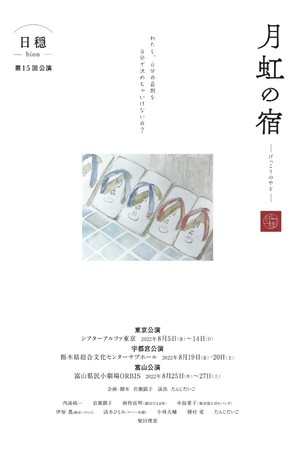 日穏-bion-(主宰:岩瀬顕子)主催、日穏-bion- 第15回公演『月虹の宿 (2022) 』が全国3都市にて上演されます。 【東京公演】2022年8月5日 (金) 〜2022年8月14日 (日)/シアター・アルファ東京(東京都渋谷区東3-24-7B1F) 【宇都宮公演】2022年8月19日 (金) 〜2022年8月20日 (土)/栃木県総合文化センター サブホール(栃木県宇都宮市本町1-8) 【富山公演】2022年8月25日 (木) 〜2022年8月27日 (土)/富山県民小劇場ORBIS(富山県富山市桜町1-1-61マリエとやま7階) チケットはカンフェティ(運営:ロングランプランニング株式会社、東京都新宿区、代表取締役:榑松 大剛)にて5月14日(土)10:00より発売開始です。