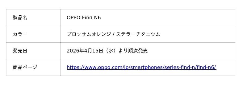 革新的なデザインとテクノロジーで業界をリードするスマートデバイスブランドOPPOは、日本で初となるOPPOのハイエンドフォルダブルスマートフォン、Find Nシリーズの最新機種「OPPO Find N6」(オッポ ファインド エヌ シックス)を一部の販売チャネルにて、4月15日(水)より順次販売を開始します。(販売開始日、販売価格は取扱い各社にお問い合わせください。)