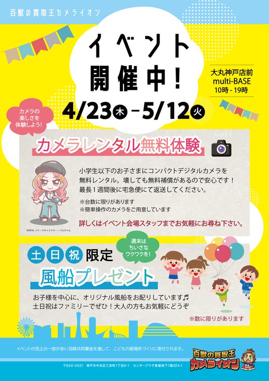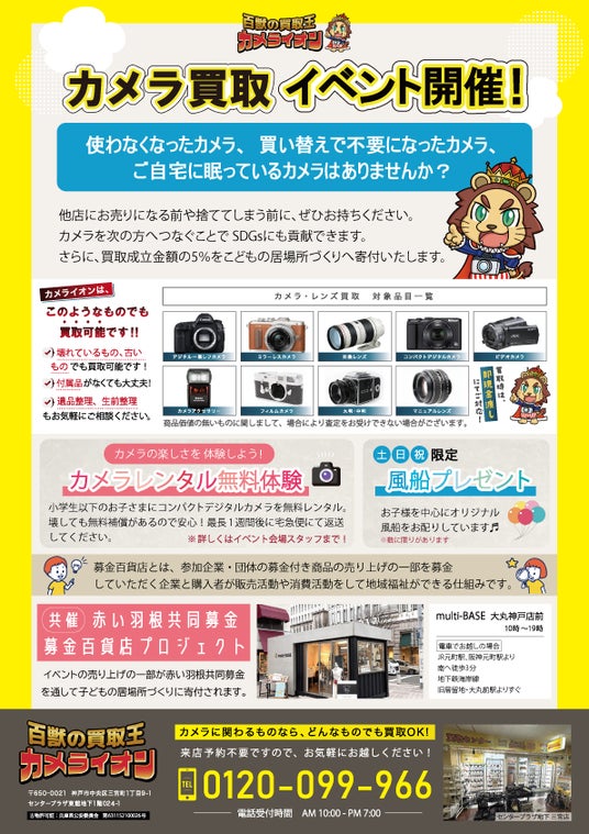 株式会社グローウイングス(本社:兵庫県神戸市、代表:羽根田佐知子)は、使われなくなったカメラの再利用と子ども支援を組み合わせた参加型チャリティイベント「あなたのカメラがこども達の笑顔に!」を、2026年4月23日(木)より大丸神戸店前にて開催いたします。