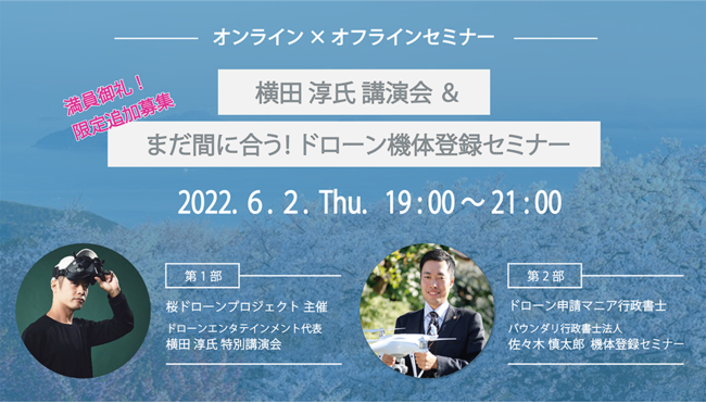 ドローンの関連許認可申請とソリューション開発を専門とするバウンダリ行政書士法人(本社:宮城県、代表行政書士:佐々木 慎太郎)は、2022年6月20日(月)から義務化される「機体登録制度」を踏まえ、ドローンに関心がある人やドローン保持者を対象にした「機体登録セミナー」を2022年6月2日(木)に開催いたします。セミナーでは「桜ドローンプロジェクト」でも知られる株式会社ドローンエンタテインメント代表横田淳氏をお招きした講演会も同時開催いたします。