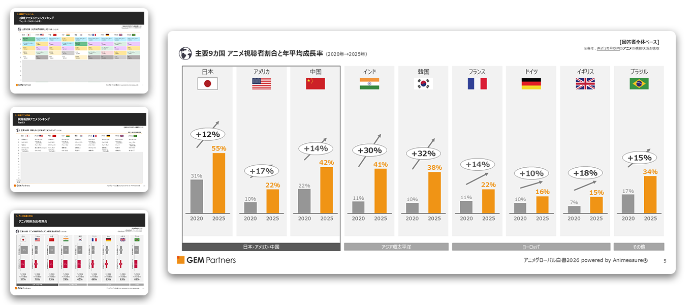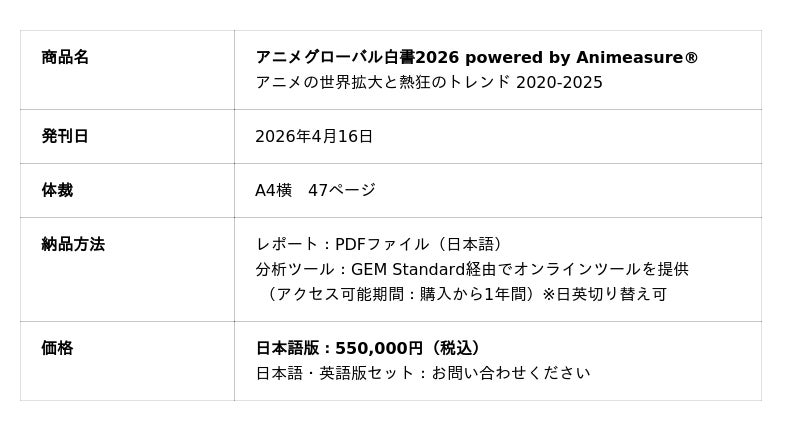 エンタテイメント業界に向けたデータ×デジタルマーケティングサービスを提供するGEM Partners株式会社(ジェムパートナーズ、本社:東京都港区、代表取締役:梅津文)は4月16日(木)、グローバル市場でのアニメファンの動向を可視化した「アニメグローバル白書2026 powered by Animeasure(R) アニメの世界拡大と熱狂のトレンド 2020-2025」の販売を開始いたしました。