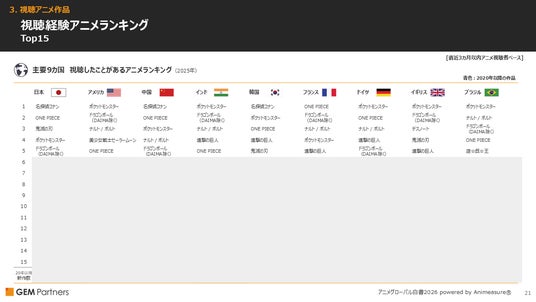 主要9カ国 視聴したことがあるアニメランキング(2025年)