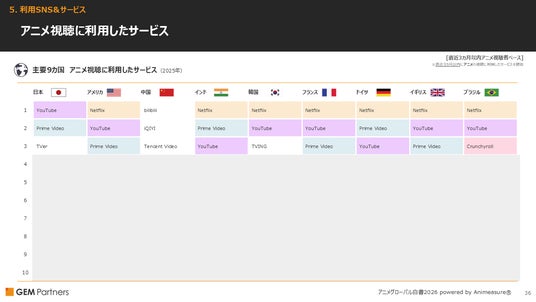 ・アニメ視聴に使用したサービスは、「Netflix」が日本と中国以外でトップ。「Prime Video」「YouTube」も多くの国で上位にランクイン。