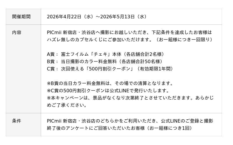 本キャンペーンでは、チェキやPICmii割引クーポンが当たる、ハズレ無しの「カプセルくじ」の実施に加え、PICmiiで撮影した写真を大切に保管できる「オリジナル写真台紙」を先着300組の方への配布を実施いたします。