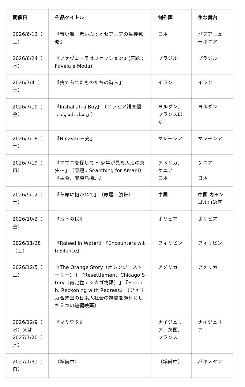 2026年度のプログラムは、ブラジル、イラン、ヨルダン、ケニア、ボリビア、ナイジェリアなど、日本国内では紹介される機会が限られた地域の作品を数多く含んでいます。これらの作品群は、現代世界が直面する切実なテーマを鮮やかに描き出しています。