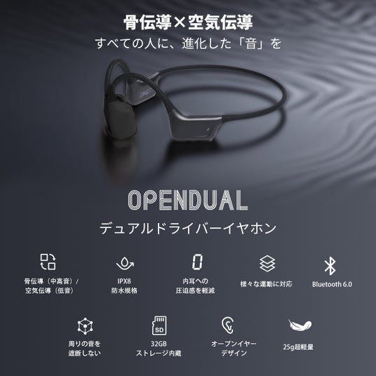IPX8防水の骨伝導×空気伝導 デュアルドライバーイヤホン「OpenDual」(オープンデュアル)。