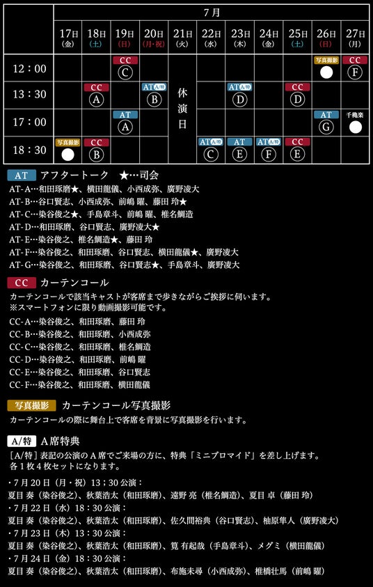 ※一部公演日に、「カーテンコール(該当キャストが客席までご挨拶)」「集合写真撮影」「A席特典ミニブロマイド」の施策が追加されました。