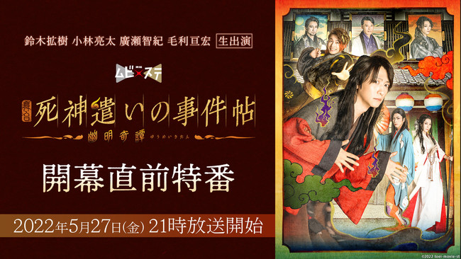 2022年6月9日に初日を迎える、東映ムビ×ステ 舞台『死神遣いの事件帖 -幽明奇譚-』の開幕直前特別番組がキャストの鈴木拡樹、小林亮太、廣瀬智紀、そして脚本・演出の毛利亘宏生出演でニコニコ生放送で5月27日(金)21時から放送が決定した。