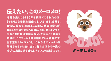 今年開局60周年を迎えたメ〜テレ(名古屋テレビ放送)は、「伝えたい、このメ〜ロメロ!」を合言葉に、地域のみなさまへの感謝と地元愛を、様々な形でお届けしています。