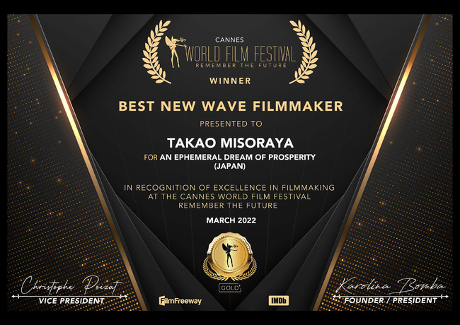 2022年4月28日に、福岡を拠点に舞台役者として活動している三天屋多嘉雄(みそらやたかお:福岡県出身、有限会社福陽開発)は、監督・脚本を務めた長編映画「邯鄲の夢」が、Cannes World Film Festival - Remember the FutureにてBEST NEW WAVE FILMMAKER(ニューウェーブフィルムメーカー部門)、BEST ASIAN FILM(アジア部門)の2部門で月間最優秀賞(3月期)を受賞、他5部門でノミネートに選出されたことをお知らせいたします。 ※なお、世界三大映画祭と言われているカンヌ国際映画祭とは異なる映画祭です。