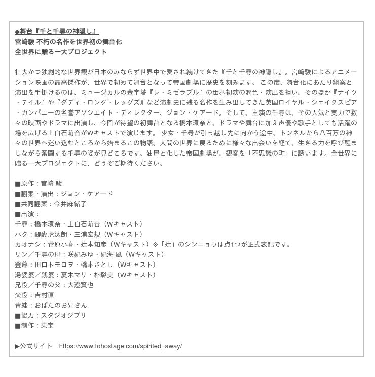 ▶舞台『千と千尋の神隠し』公式サイト https://www.tohostage.com/spirited_away/