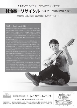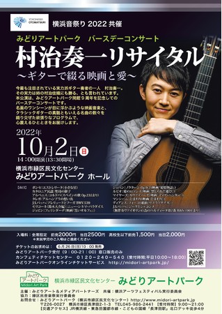みどりアート&メディアパートナーズ 横浜音祭り2022共催 みどりアートパーク バースデーコンサート『村治奏一リサイタル〜ギターで綴る映画と愛〜』が2022年10月2日(日)に緑区民文化センター(みどりアートパーク)(横浜市)にて開催されます。チケットはカンフェティ(運営:ロングランプランニング株式会社、東京都新宿区、代表取締役:榑松 大剛)にて6月26日(日)より発売開始です。