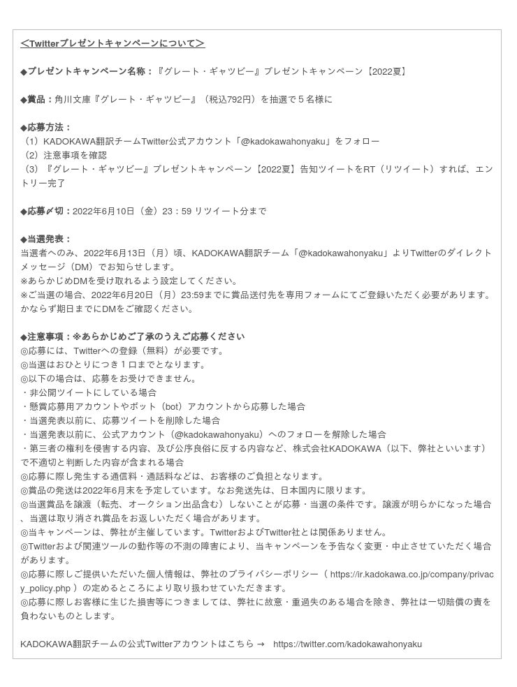 株式会社KADOKAWAより、6月10日(金)フィツジェラルドの代表作『グレート・ギャツビー』を発売。これを記念し、Twitterにて、本書を5名様にプレゼントするキャンペーンを実施します。