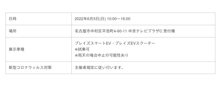 ブレイズでは、「ブレイズスマートEV」・「ブレイズEVスクーター」の展示および試乗会を行います。